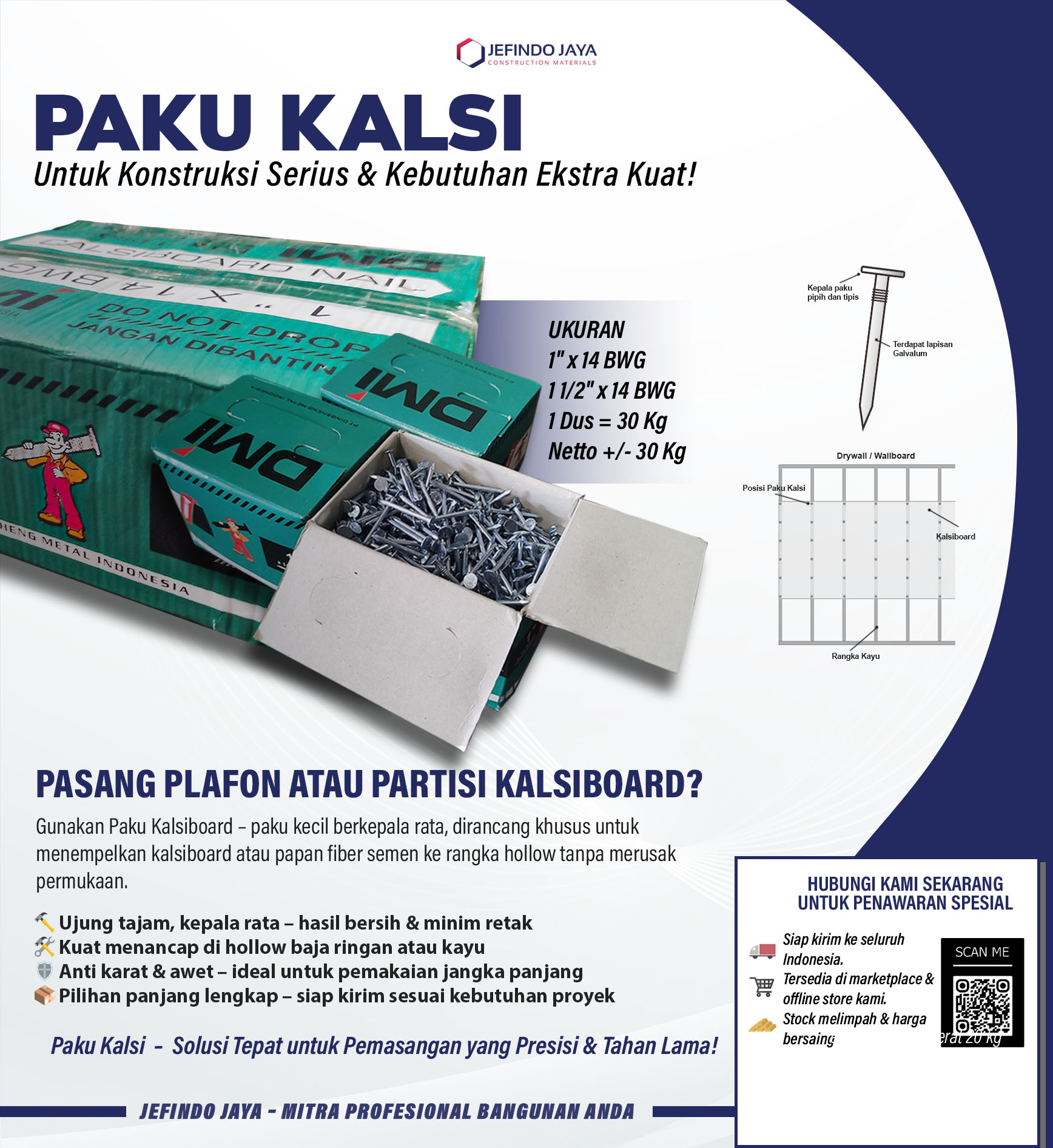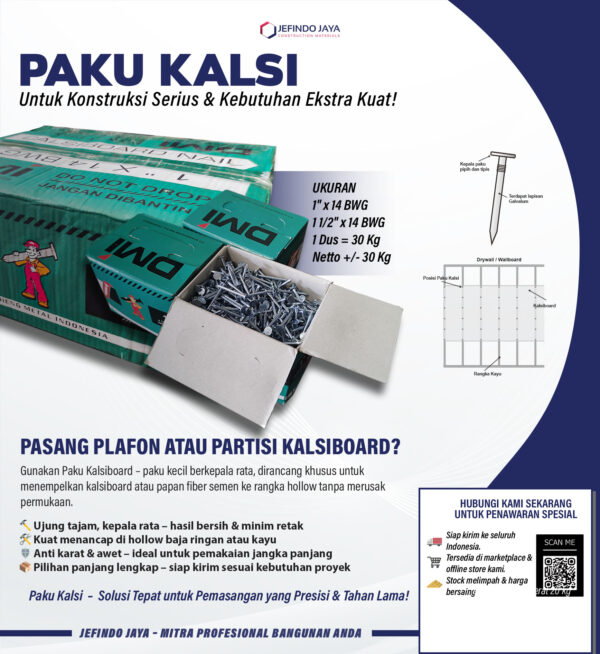 Dengan karakteristik tersebut, paku kalsiboard memastikan pemasangan lembaran fiber semen yang aman, kuat, dan tahan lama pada rangka kayu.