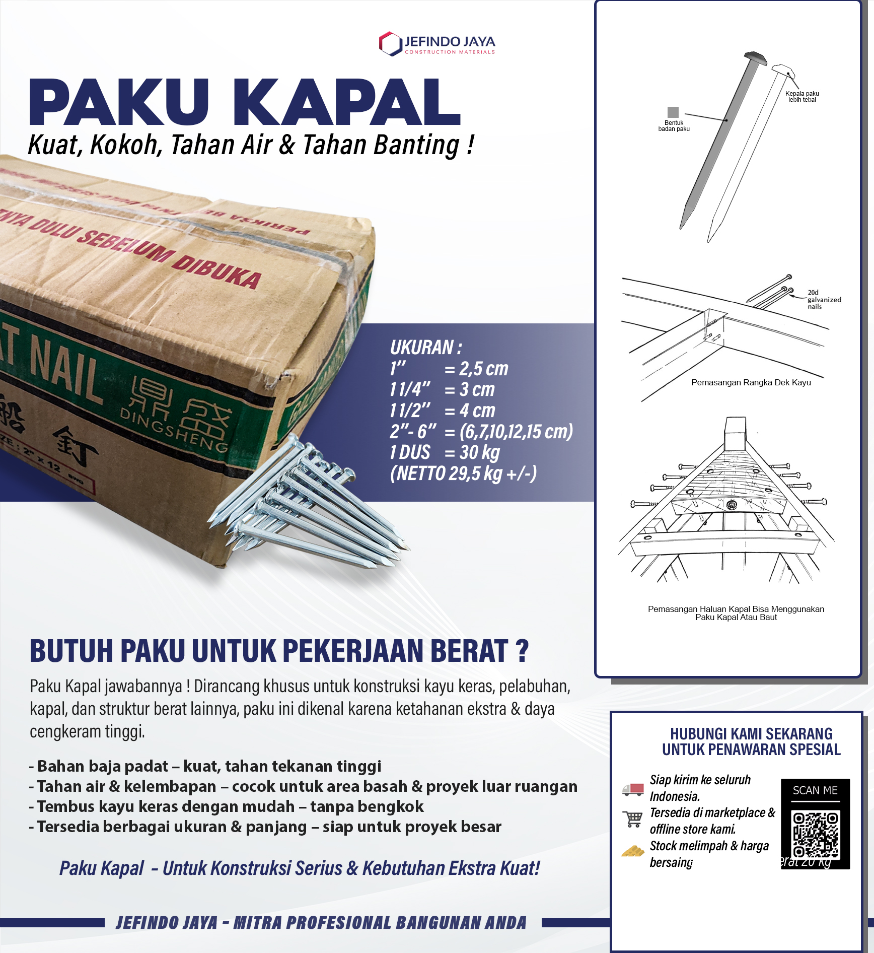 - Material dan Ketahanan: Paku kapal biasanya terbuat dari baja tahan karat atau besi yang dilapisi dengan lapisan anti korosi seperti galvanis. Ini untuk memastikan ketahanan terhadap air laut, kelembapan tinggi, dan kondisi lingkungan ekstrem.