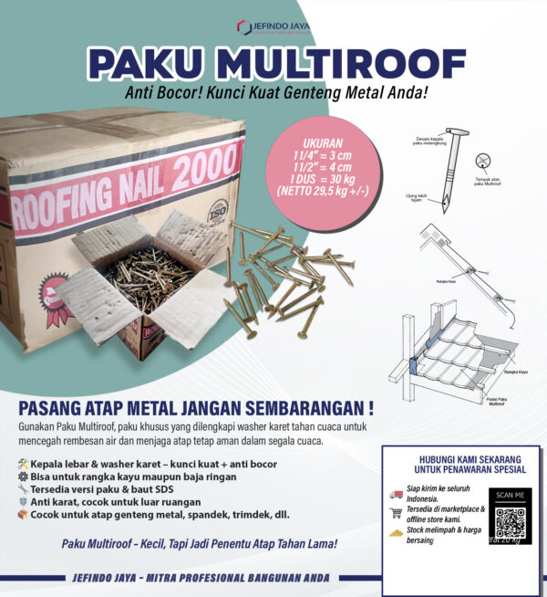 Dengan karakteristik tersebut, paku roofing memberikan solusi yang efisien dan tahan lama untuk pemasangan atap, memastikan bangunan terlindungi dari berbagai kondisi cuaca dan tetap nyaman di dalamnya.