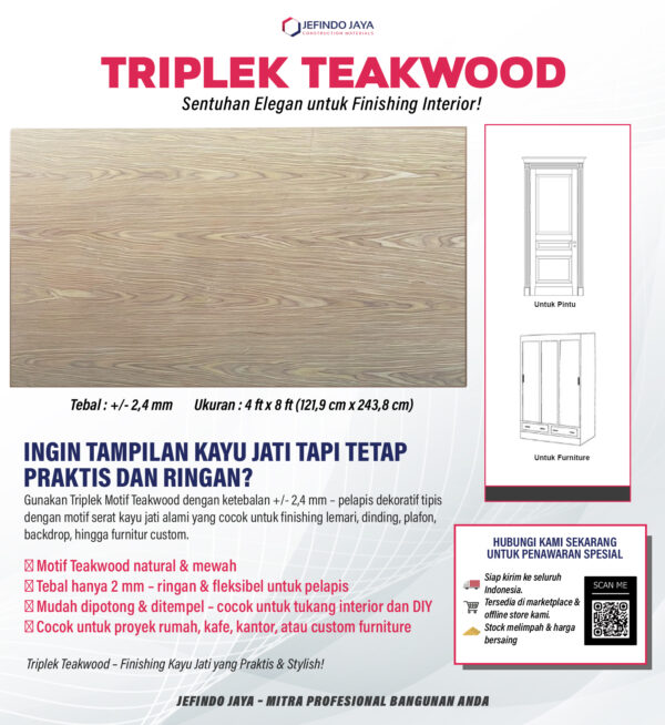 Triplek teakwood adalah jenis plywood yang menggunakan veneer kayu jati (teak) pada lapisan terluarnya. Kayu jati terkenal dengan kekuatan, daya tahan, dan keindahan alami serat kayunya. Triplek teakwood menggabungkan keunggulan kayu jati dengan fleksibilitas dan kepraktisan plywood, membuatnya sangat cocok untuk berbagai aplikasi yang memerlukan bahan berkualitas tinggi dan tampilan estetis.